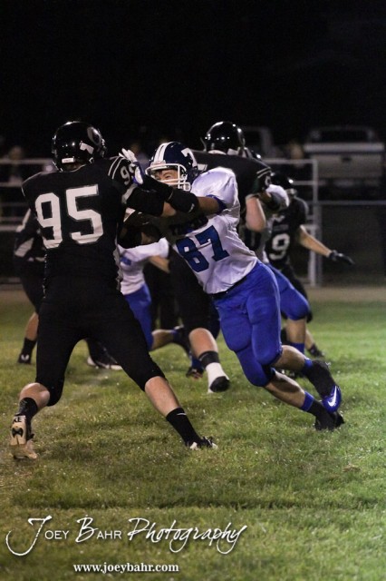 A St. John Tiger blocks Central Plains Oiler Evan Liebl (#95) during the St. John versus Central Plains High School Football Game with Central Plains winning 54 to 8 at Central Plains High School in Claflin, Kansas on September 20, 2013. (Photo: Joey Bahr, www.joeybahr.com)