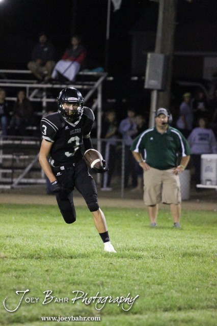 Central Plains Oiler Layne Bieberle (#3) runs with the ball during the St. John versus Central Plains High School Football Game with Central Plains winning 54 to 8 at Central Plains High School in Claflin, Kansas on September 20, 2013. (Photo: Joey Bahr, www.joeybahr.com)