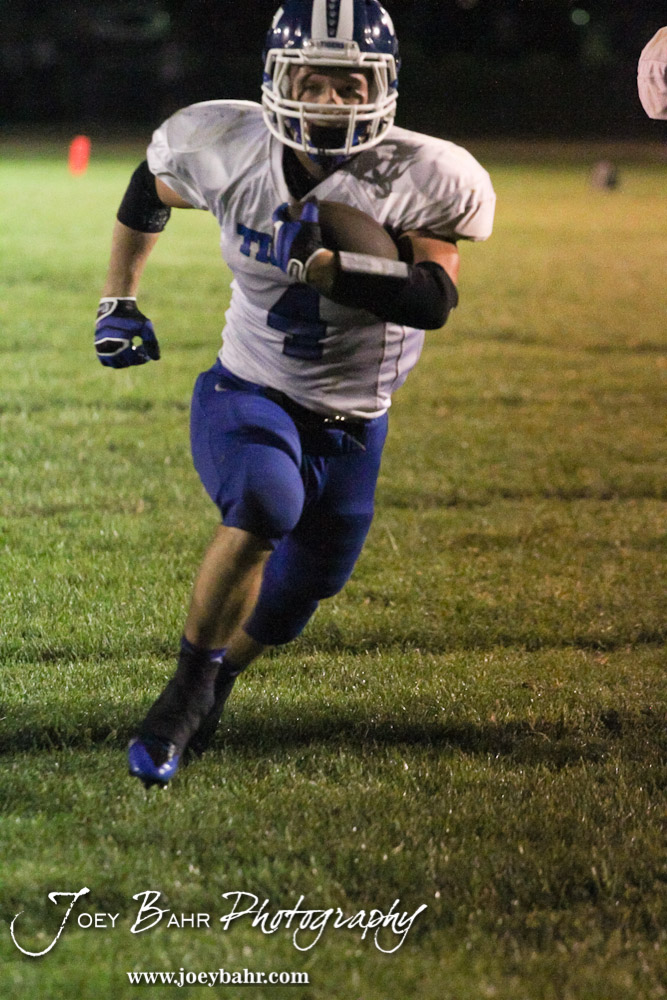 St. John Tiger Schuyler Brown (#4) runs in for a score during the St. John versus Central Plains High School Football Game with Central Plains winning 54 to 8 at Central Plains High School in Claflin, Kansas on September 20, 2013. (Photo: Joey Bahr, www.joeybahr.com)