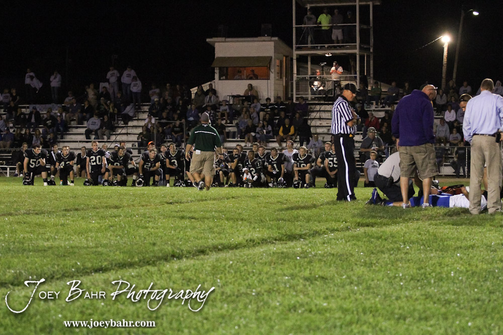 Central Plains Oiler Head Coach Chris Steiner walks back to his sideline as a St. John Tiger is tended to by medical personnel during the St. John versus Central Plains High School Football Game with Central Plains winning 54 to 8 at Central Plains High School in Claflin, Kansas on September 20, 2013. (Photo: Joey Bahr, www.joeybahr.com)