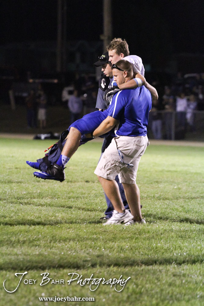 St. John Tiger Head Coach Chris Story carries one of his players off the field during the St. John versus Central Plains High School Football Game with Central Plains winning 54 to 8 at Central Plains High School in Claflin, Kansas on September 20, 2013. (Photo: Joey Bahr, www.joeybahr.com)
