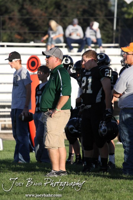 Central Plains Oiler Head Coach Chris Steiner watches his team during warmups before the St. John versus Central Plains High School Football Game with Central Plains winning 54 to 8 at Central Plains High School in Claflin, Kansas on September 20, 2013. (Photo: Joey Bahr, www.joeybahr.com)