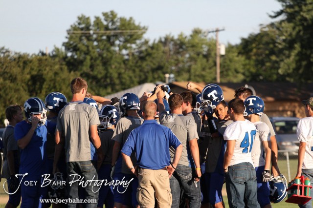 The St. John Tigers huddle up prior to the St. John versus Central Plains High School Football Game with Central Plains winning 54 to 8 at Central Plains High School in Claflin, Kansas on September 20, 2013. (Photo: Joey Bahr, www.joeybahr.com)