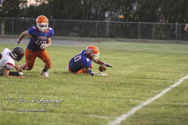 Otis-Bison Cougar #80 Seth Hoopingarner jumps on a loose ball to cause a turnover. The Stafford Trojans faced the Otis-Bison Cougars at Cougar Field in Otis, Kansas on September 14, 2018. (Photo: Joey Bahr, www.joeybahr.com)undefined
