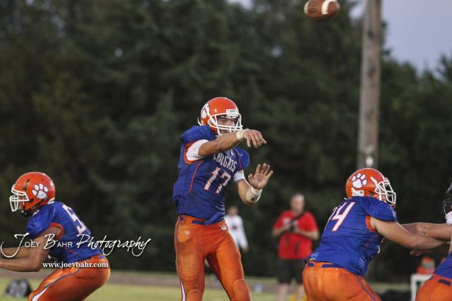 Otis-Bison Cougar #17 Anton Foust throws a pass. Otis-Bison Cougar #17 Anton Foust throws a pass in the second quarter. The Stafford Trojans faced the Otis-Bison Cougars at Cougar Field in Otis, Kansas on September 14, 2018. (Photo: Joey Bahr, www.joeybahr.com)undefined