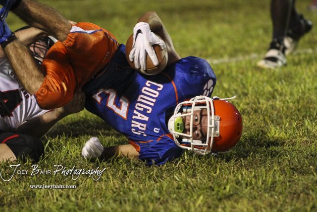 Otis-Bison Cougar #2 Caleb Cheely falls to the ground after being tackled by Stafford Trojan #4 Ethan Hildebrand. The Stafford Trojans faced the Otis-Bison Cougars at Cougar Field in Otis, Kansas on September 14, 2018. (Photo: Joey Bahr, www.joeybahr.com)undefined