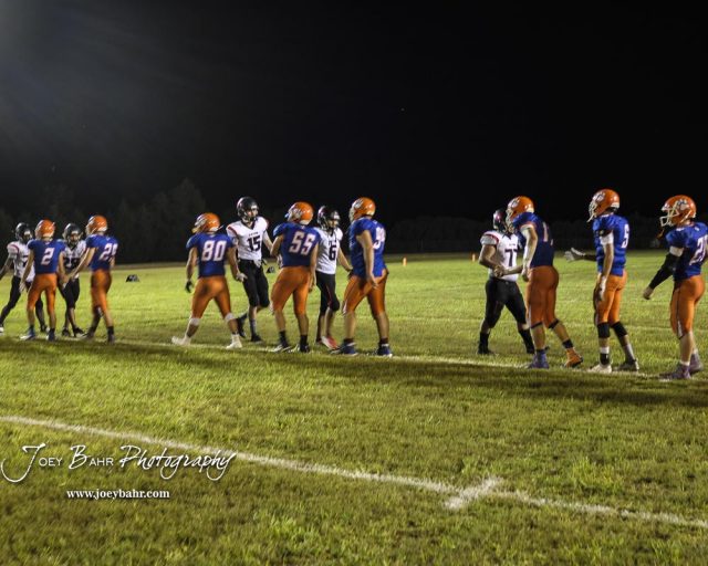 Members of the Stafford Trojans and Otis-Bison Cougars shake hands following the game. The Otis-Bison Cougars defeated the Stafford Trojans by a score of 50 to 0 at Cougar Field in Otis, Kansas on September 14, 2018. (Photo: Joey Bahr, www.joeybahr.com)undefined