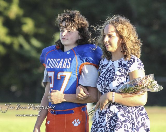 Sophomore attendants Bryce Frazier and Danica Bartonek stand during Homecoming festivities. The Stafford Trojans faced the Otis-Bison Cougars at Cougar Field in Otis, Kansas on September 14, 2018. (Photo: Joey Bahr, www.joeybahr.com)undefined