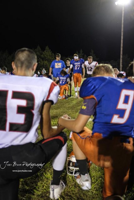 Members of the Otis-Bison Cougars and Stafford Trojans join together for a post game prayer. The Otis-Bison Cougars defeated the Stafford Trojans by a score of 50 to 0 at Cougar Field in Otis, Kansas on September 14, 2018. (Photo: Joey Bahr, www.joeybahr.com)undefined
