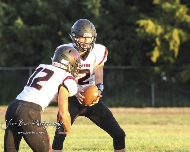 Stafford Trojan #2 Justice Manning hands off the ball to #12 Caleb Hildebrand in the first quarter. The Stafford Trojans faced the Otis-Bison Cougars at Cougar Field in Otis, Kansas on September 14, 2018. (Photo: Joey Bahr, www.joeybahr.com)undefined