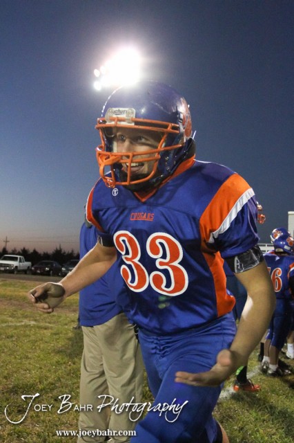 Otis-Bison Cougar Jordan Hoffman (#33) runs out for player introductions before the Sylvan-Lucas vs Otis-Bison High School football game with Otis-Bison winning 32 to 30 at Otis-Bison High School Field in Otis, Kansas on October 31, 2013. (Photo: Joey Bahr, www.joeybahr.com)