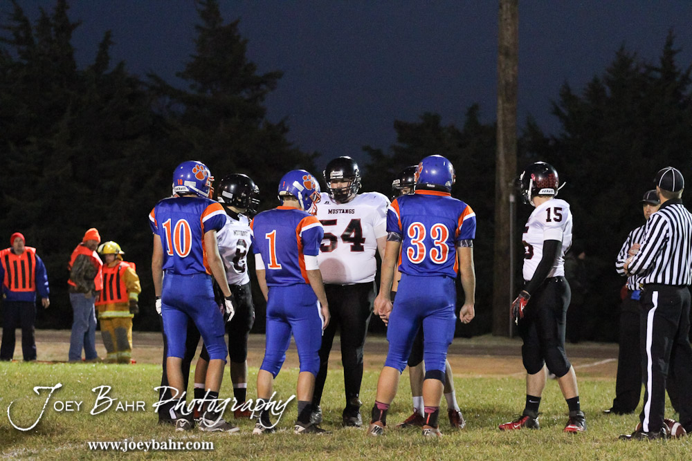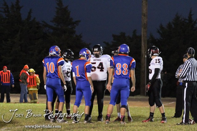 The Sylvan-Lucas Mustang and Otis-Bison Cougar Captains meet for the coin toss before the Sylvan-Lucas vs Otis-Bison High School football game with Otis-Bison winning 32 to 30 at Otis-Bison High School Field in Otis, Kansas on October 31, 2013. (Photo: Joey Bahr, www.joeybahr.com)
