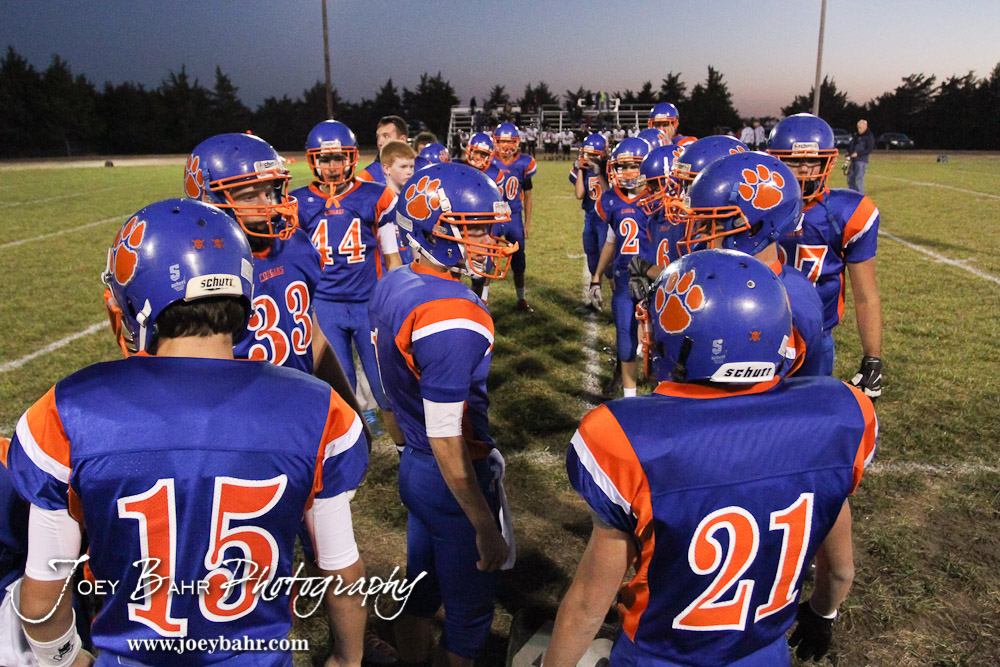 Otis-Bison Cougar Kole Urban (#1) addresses his teammates before the Sylvan-Lucas vs Otis-Bison High School football game with Otis-Bison winning 32 to 30 at Otis-Bison High School Field in Otis, Kansas on October 31, 2013. (Photo: Joey Bahr, www.joeybahr.com)