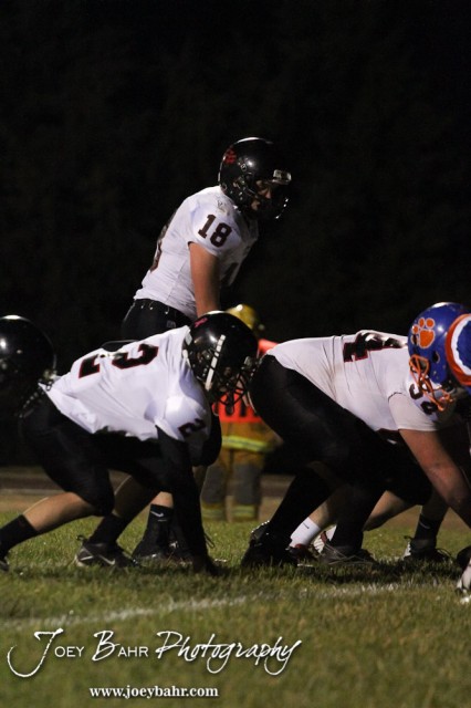 Sylvan-Lucas Mustang Collin Herold (#18) prepares to go under center during the Sylvan-Lucas vs Otis-Bison High School football game with Otis-Bison winning 32 to 30 at Otis-Bison High School Field in Otis, Kansas on October 31, 2013. (Photo: Joey Bahr, www.joeybahr.com)