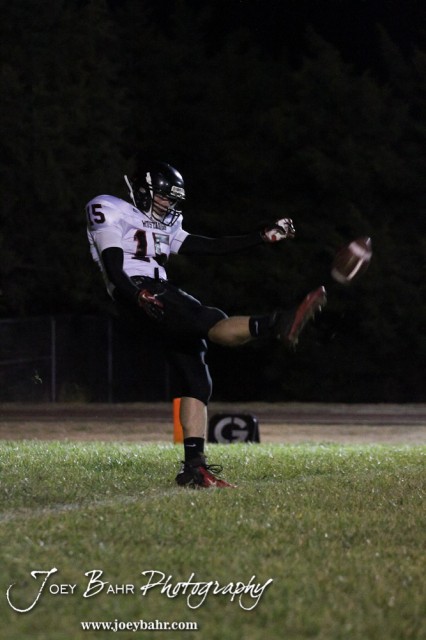 Sylvan-Lucas Mustang Nick Lawson (#15) punts the ball during the Sylvan-Lucas vs Otis-Bison High School football game with Otis-Bison winning 32 to 30 at Otis-Bison High School Field in Otis, Kansas on October 31, 2013. (Photo: Joey Bahr, www.joeybahr.com)