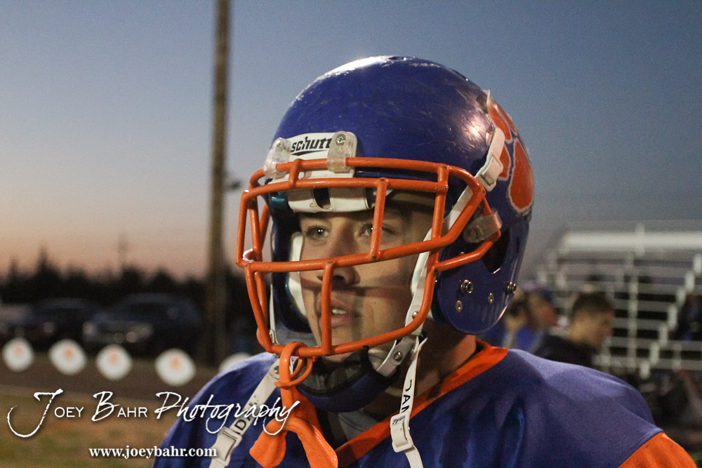 Otis-Bison Cougar Kade Hagans (#23) waits for the introduction of players prior to the Sylvan-Lucas vs Otis-Bison High School football game with Otis-Bison winning 32 to 30 at Otis-Bison High School Field in Otis, Kansas on October 31, 2013. (Photo: Joey Bahr, www.joeybahr.com)