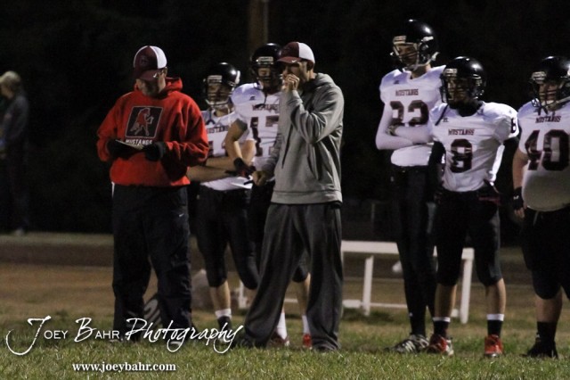 Sylvan-Lucas Mustang Head Coach Ben Labertew calls out to his players during the Sylvan-Lucas vs Otis-Bison High School football game with Otis-Bison winning 32 to 30 at Otis-Bison High School Field in Otis, Kansas on October 31, 2013. (Photo: Joey Bahr, www.joeybahr.com)