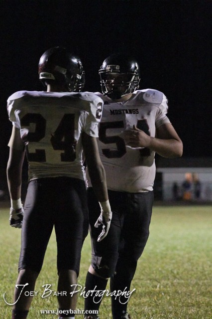 Sylvan-Lucas Mustang Kelvin Lopez (#24) talks to Fritz Berger (#54) after a play during the Sylvan-Lucas vs Otis-Bison High School football game with Otis-Bison winning 32 to 30 at Otis-Bison High School Field in Otis, Kansas on October 31, 2013. (Photo: Joey Bahr, www.joeybahr.com)