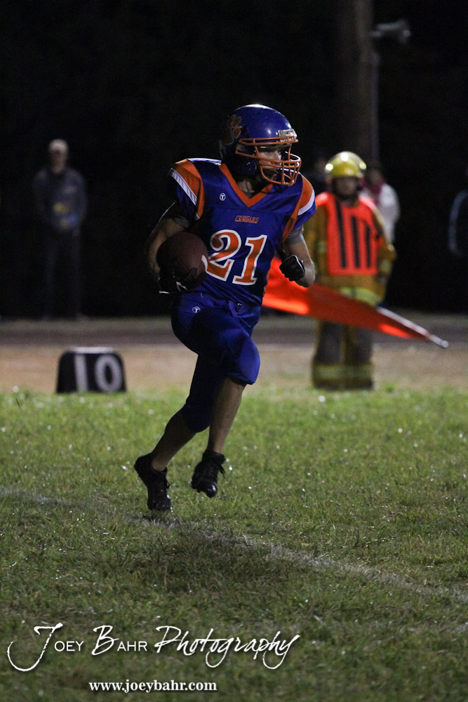 Otis-Bison Cougar Brad Lightfoot (#21) returns a kick during the Sylvan-Lucas vs Otis-Bison High School football game with Otis-Bison winning 32 to 30 at Otis-Bison High School Field in Otis, Kansas on October 31, 2013. (Photo: Joey Bahr, www.joeybahr.com)