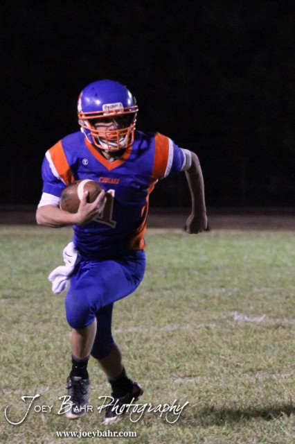 Otis-Bison Cougar Kole Urban (#1) runs with the ball during the Sylvan-Lucas vs Otis-Bison High School football game with Otis-Bison winning 32 to 30 at Otis-Bison High School Field in Otis, Kansas on October 31, 2013. (Photo: Joey Bahr, www.joeybahr.com)