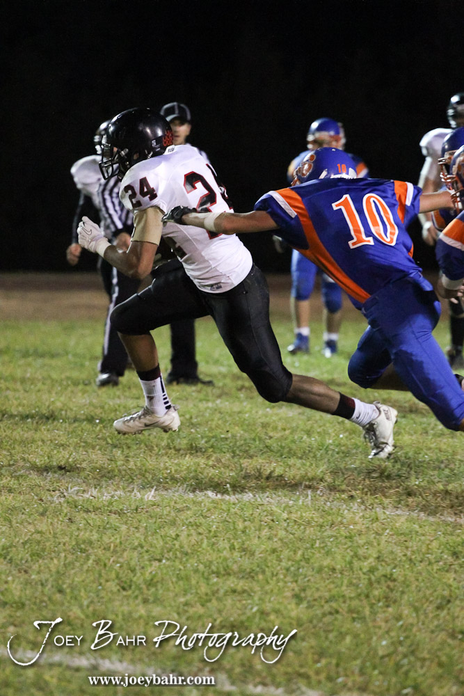 Otis-Bison Cougar Colin Regan (#10) tries to tackle Sylvan-Lucas Mustang Kelvin Lopez (#24) during the Sylvan-Lucas vs Otis-Bison High School football game with Otis-Bison winning 32 to 30 at Otis-Bison High School Field in Otis, Kansas on October 31, 2013. (Photo: Joey Bahr, www.joeybahr.com)