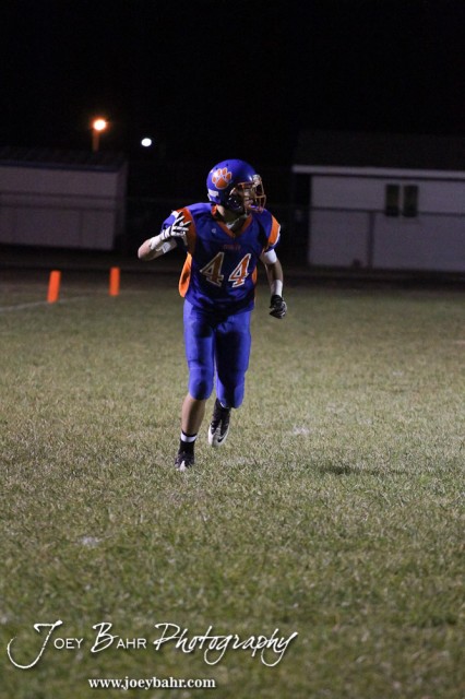 Otis-Bison Cougar Hayden Maier (#44) runs a route during the Sylvan-Lucas vs Otis-Bison High School football game with Otis-Bison winning 32 to 30 at Otis-Bison High School Field in Otis, Kansas on October 31, 2013. (Photo: Joey Bahr, www.joeybahr.com)