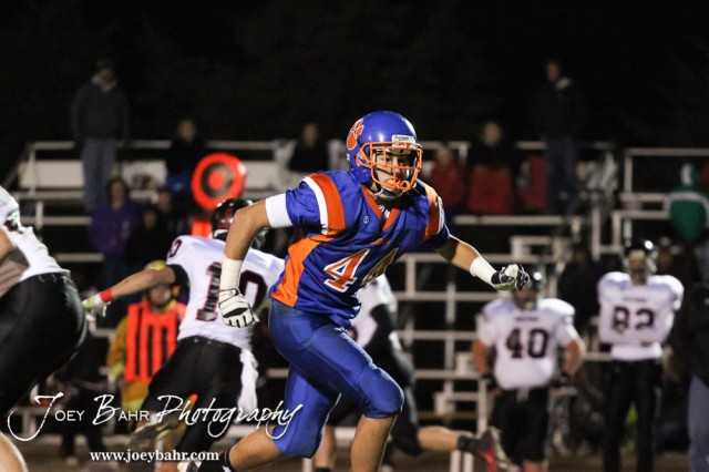 Otis-Bison Cougar Hayden Maier (#44) runs a route during the Sylvan-Lucas vs Otis-Bison High School football game with Otis-Bison winning 32 to 30 at Otis-Bison High School Field in Otis, Kansas on October 31, 2013. (Photo: Joey Bahr, www.joeybahr.com)