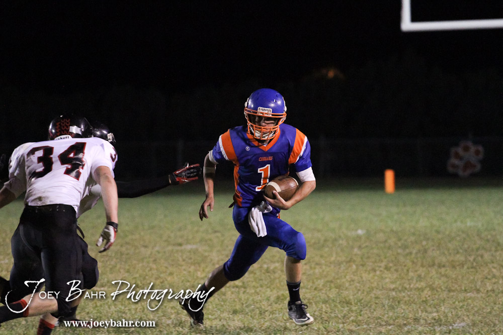 Otis-Bison Cougar Kole Urban (#1) runs around the corner during the Sylvan-Lucas vs Otis-Bison High School football game with Otis-Bison winning 32 to 30 at Otis-Bison High School Field in Otis, Kansas on October 31, 2013. (Photo: Joey Bahr, www.joeybahr.com)