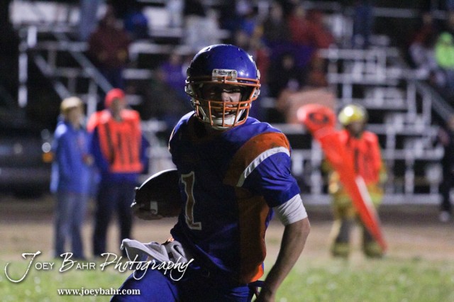 Otis-Bison Cougar Kole Urban (#1) celebrates scoring a touchdown during the Sylvan-Lucas vs Otis-Bison High School football game with Otis-Bison winning 32 to 30 at Otis-Bison High School Field in Otis, Kansas on October 31, 2013. (Photo: Joey Bahr, www.joeybahr.com)