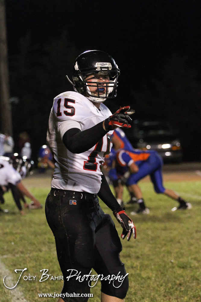 Sylvan-Lucas Mustang Nick Lawson (#15) checks to see if he is on the line during the Sylvan-Lucas vs Otis-Bison High School football game with Otis-Bison winning 32 to 30 at Otis-Bison High School Field in Otis, Kansas on October 31, 2013. (Photo: Joey Bahr, www.joeybahr.com)