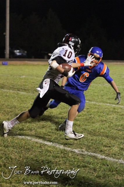 Sylvan-Lucas Mustang Ty Heenan (#10) stiff arms Otis-Bison Cougar Dejay Vaughn (#6) during the Sylvan-Lucas vs Otis-Bison High School football game with Otis-Bison winning 32 to 30 at Otis-Bison High School Field in Otis, Kansas on October 31, 2013. (Photo: Joey Bahr, www.joeybahr.com)