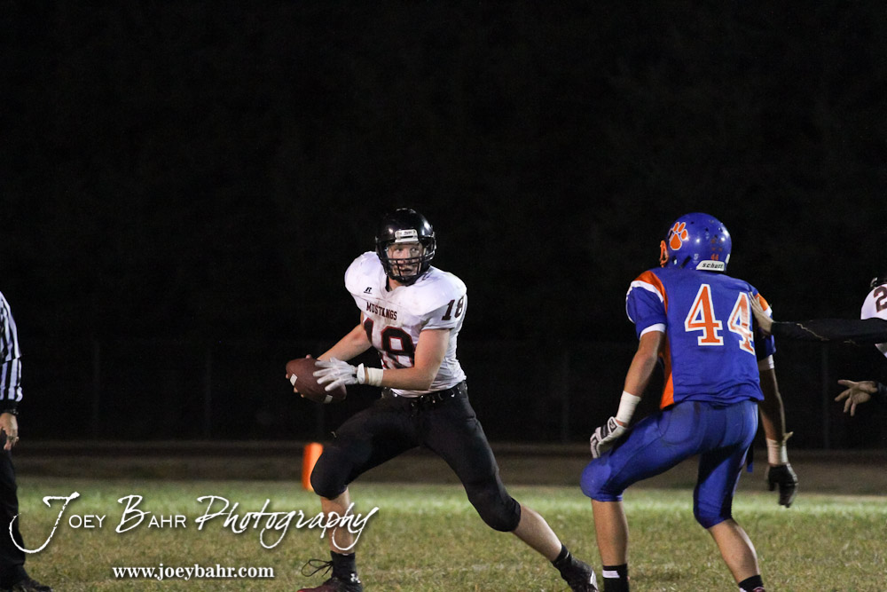 Sylvan-Lucas Mustang Collin Herold (#18) looks for an open receiver as /ob44 applies pressure during the Sylvan-Lucas vs Otis-Bison High School football game with Otis-Bison winning 32 to 30 at Otis-Bison High School Field in Otis, Kansas on October 31, 2013. (Photo: Joey Bahr, www.joeybahr.com)
