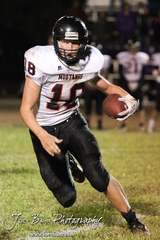 Sylvan-Lucas Mustang Collin Herold (#18) runs with the ball during the Sylvan-Lucas vs Otis-Bison High School football game with Otis-Bison winning 32 to 30 at Otis-Bison High School Field in Otis, Kansas on October 31, 2013. (Photo: Joey Bahr, www.joeybahr.com)