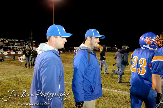 Otis-Bison Cougar Head Coach Travis Starr and Assistant Coach Curtis Little smile after winning the Sylvan-Lucas vs Otis-Bison High School football game with Otis-Bison winning 32 to 30 at Otis-Bison High School Field in Otis, Kansas on October 31, 2013. (Photo: Joey Bahr, www.joeybahr.com)