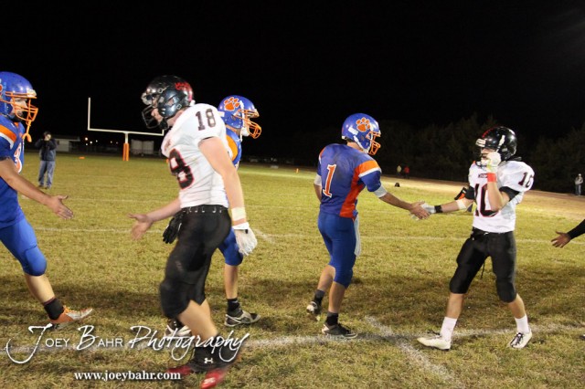 Members of the Sylvan-Lucas Mustangs and Otis-Bison Cougars shake hands following the Sylvan-Lucas vs Otis-Bison High School football game with Otis-Bison winning 32 to 30 at Otis-Bison High School Field in Otis, Kansas on October 31, 2013. (Photo: Joey Bahr, www.joeybahr.com)