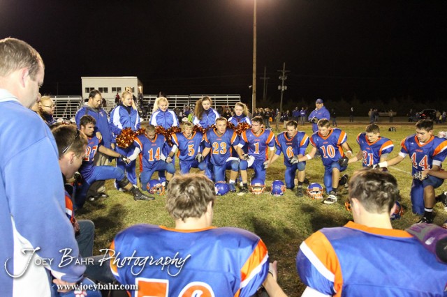 The Otis-Bison Cougars pray following the Sylvan-Lucas vs Otis-Bison High School football game with Otis-Bison winning 32 to 30 at Otis-Bison High School Field in Otis, Kansas on October 31, 2013. (Photo: Joey Bahr, www.joeybahr.com)