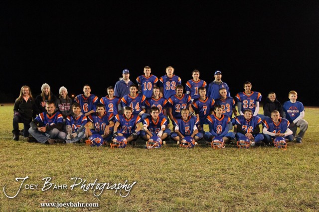 The Otis-Bison Cougars take a team picture following the Sylvan-Lucas vs Otis-Bison High School football game with Otis-Bison winning 32 to 30 at Otis-Bison High School Field in Otis, Kansas on October 31, 2013. (Photo: Joey Bahr, www.joeybahr.com)