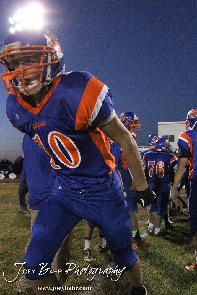 Otis-Bison Cougar Colin Regan (#10) runs out for player introductions before the Sylvan-Lucas vs Otis-Bison High School football game with Otis-Bison winning 32 to 30 at Otis-Bison High School Field in Otis, Kansas on October 31, 2013. (Photo: Joey Bahr, www.joeybahr.com)