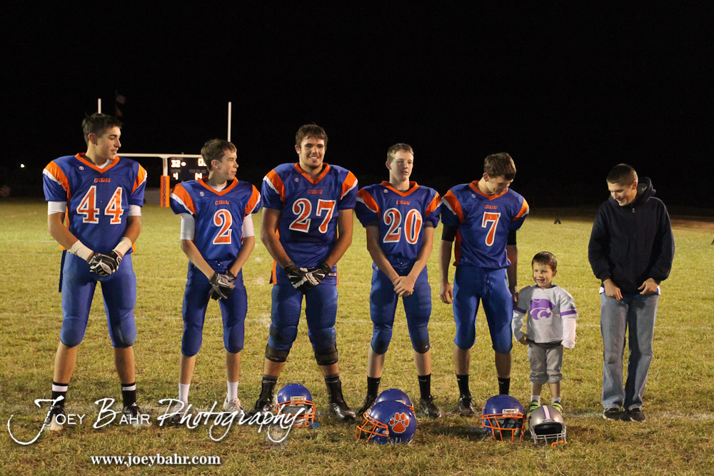 The Otis-Bison Cougars Sophomores and Marcus Starr take a team picture following the Sylvan-Lucas vs Otis-Bison High School football game with Otis-Bison winning 32 to 30 at Otis-Bison High School Field in Otis, Kansas on October 31, 2013. (Photo: Joey Bahr, www.joeybahr.com)