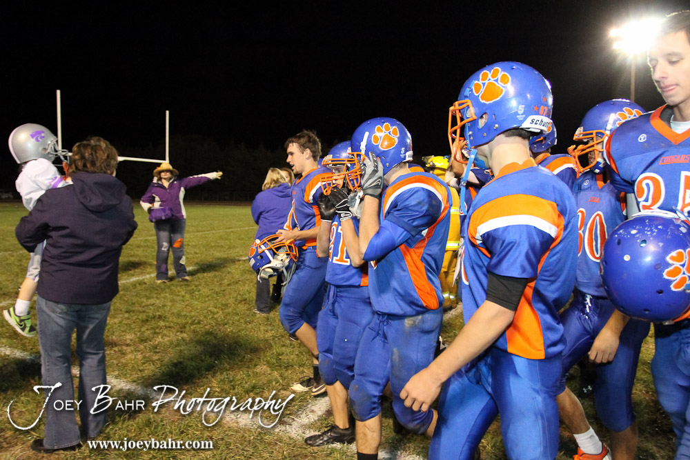 The Otis-Bison Cougars line up to leave the field following the Sylvan-Lucas vs Otis-Bison High School football game with Otis-Bison winning 32 to 30 at Otis-Bison High School Field in Otis, Kansas on October 31, 2013. (Photo: Joey Bahr, www.joeybahr.com)