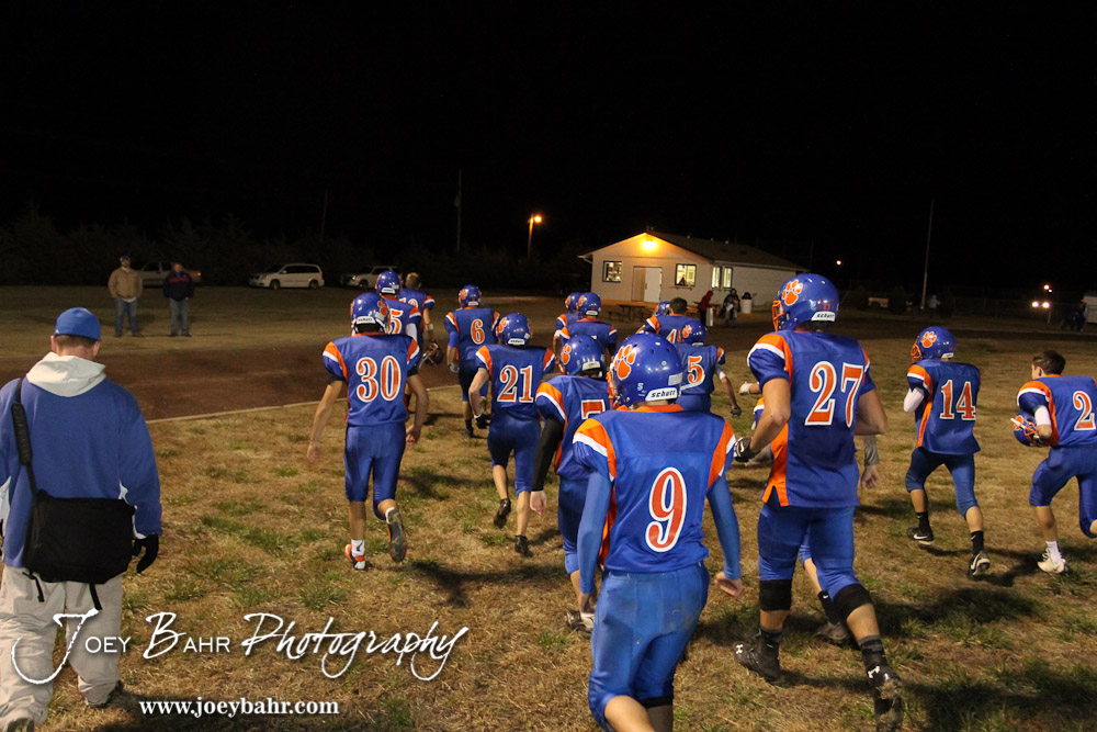 The Otis-Bison Cougars run off the field after the Sylvan-Lucas vs Otis-Bison High School football game with Otis-Bison winning 32 to 30 at Otis-Bison High School Field in Otis, Kansas on October 31, 2013. (Photo: Joey Bahr, www.joeybahr.com)
