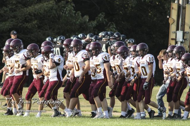 The Victoria Knights walk towards the field in front of the huddle of the Central Plains Oilers before the restart of the delayed game. The Victoria Knights defeated the Central Plains Oilers by a score of 34 to 8 at Central Plains High School in Claflin, Kansas on September 2, 2017. (Photo: Joey Bahr, www.joeybahr.com)undefined