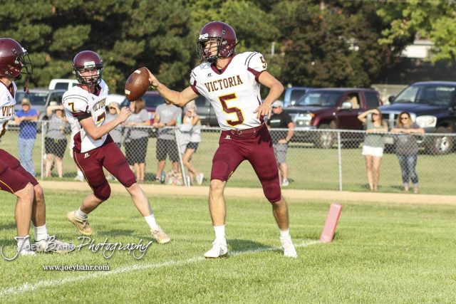 Victoria Knight #5 Collin Kisner scores a touchdown in the second quarter. The Victoria Knights defeated the Central Plains Oilers by a score of 34 to 8 at Central Plains High School in Claflin, Kansas on September 2, 2017. (Photo: Joey Bahr, www.joeybahr.com)undefined