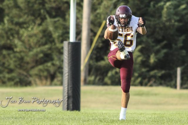 Victoria Knight #56 Cooper Pfanenstiel kicks off the ball after a touchdown was scored in the second quarter. The Victoria Knights defeated the Central Plains Oilers by a score of 34 to 8 at Central Plains High School in Claflin, Kansas on September 2, 2017. (Photo: Joey Bahr, www.joeybahr.com)undefined