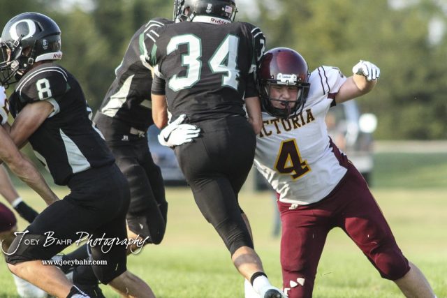 Victoria Knight #4 Cole Schmidtberger tries to wrap up Central Plains Oiler #34 Alex Barton in the second quarter. The Victoria Knights defeated the Central Plains Oilers by a score of 34 to 8 at Central Plains High School in Claflin, Kansas on September 2, 2017. (Photo: Joey Bahr, www.joeybahr.com)undefined