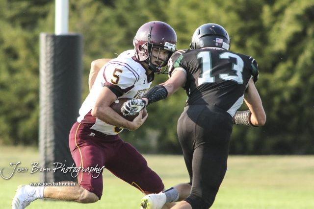 Victoria Knight #5 Collin Kisner watches as Central Plains Oiler #13 Kade Beck closes in on him in the second quarter. The Victoria Knights defeated the Central Plains Oilers by a score of 34 to 8 at Central Plains High School in Claflin, Kansas on September 2, 2017. (Photo: Joey Bahr, www.joeybahr.com)undefined