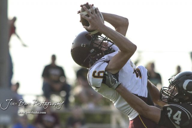 Central Plains Oiler #34 Alex Barton reaches for Victoria Knight #6 Caden Oberle as he pulls in a pass in the second quarter. The Victoria Knights defeated the Central Plains Oilers by a score of 34 to 8 at Central Plains High School in Claflin, Kansas on September 2, 2017. (Photo: Joey Bahr, www.joeybahr.com)undefined
