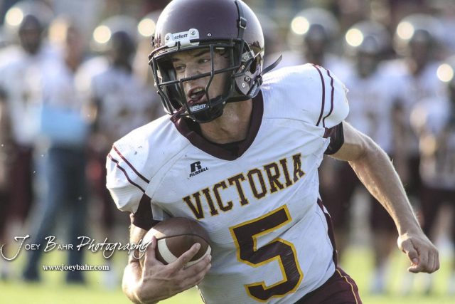 Victoria Knight #5 Collin Kisner rushes with the ball in the second quarter. The Victoria Knights defeated the Central Plains Oilers by a score of 34 to 8 at Central Plains High School in Claflin, Kansas on September 2, 2017. (Photo: Joey Bahr, www.joeybahr.com)undefined