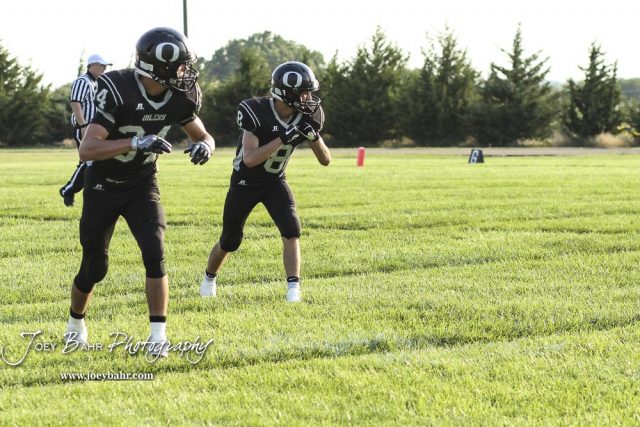 Central Plains Oilers #34 Alex Barton and #8 Anthony Oberle line up on the line of scrimmage in the second quarter. The Victoria Knights defeated the Central Plains Oilers by a score of 34 to 8 at Central Plains High School in Claflin, Kansas on September 2, 2017. (Photo: Joey Bahr, www.joeybahr.com)undefined