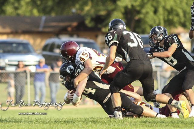 Victoria Knight #45 Wyatt Dreiling wraps up Central Plains Oiler #24 Dylan Lemieux in the third quarter. The Victoria Knights defeated the Central Plains Oilers by a score of 34 to 8 at Central Plains High School in Claflin, Kansas on September 2, 2017. (Photo: Joey Bahr, www.joeybahr.com)undefined